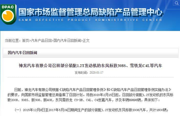 除了转向系统问题,C4L车型的发动机故障也同时被车主所诟病,问题包括发动机异响、烧机油、正时皮带脱落等。记者注意到,在2020年,神龙汽车还曾对旗下配备1.2T发动机的东风雪铁龙C4L车型进行过召回,共涉及14687辆。