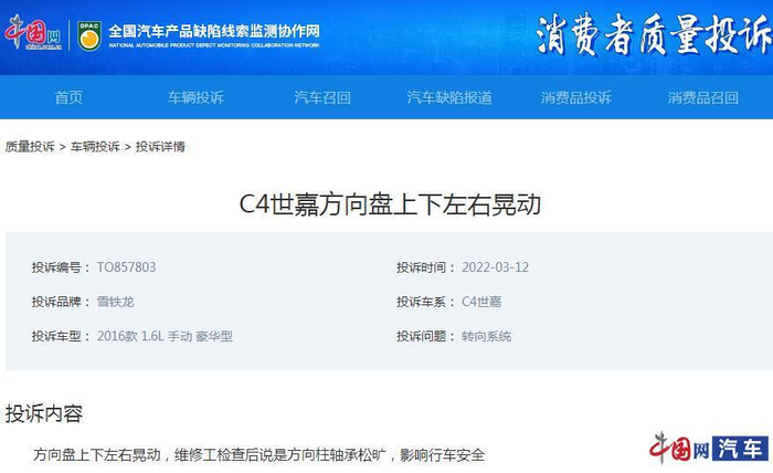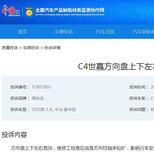 中国网汽车3月22日 (记者 王忆东)中国网汽车质量投诉平台连日来陆续接到东风雪铁龙C4世嘉车主投诉车辆方向盘晃动严重,给行车安全造成极大影响。其中有车主向记者反馈称:维修工对车辆进行检测后,表示是方向柱轴承松旷。