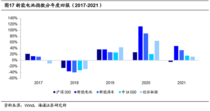 从年度回报来看,2017-2021年,新能电池指数各年度均优于同类。其中,2020和2021年分别录得112.99%以及48.01%的回报率,相对新能源车指数的超额收益分别为23.43%与14.02%,同时也大幅超越主流宽基指数。