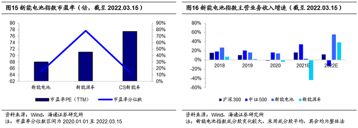从估值角度来看(图15),截至2022年3月15日,新能电池指数市盈率(PE,TTM)67.99倍,小于同类指数。时间序列上来看,指数目前的估值位于自2020年1月1日以来的15.07%历史分位点,具有较为显著的估值优势。