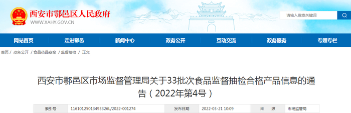 中国质量新闻网讯 2022年3月21日,西安市鄠邑区市场监督管理局发布关于33批次食品监督抽检合格产品信息的通告(2022年第4号)。