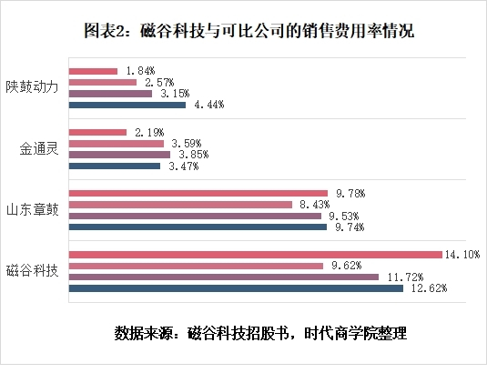 经计算可知,同期,同行业可比公司的销售费用率平均值分别为5.89%、5.51%、4.86%、4.60%,磁谷科技各期分别比行业均值高出6.73个、6.21个、4.76个、9.5个百分点,销售费用率几乎是陕鼓动力和金通灵的一到两倍。