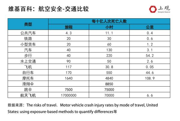 若以里程数作为计算维度,飞机是最安全的交通工具,每十亿公里的死亡人数为0.05人;但若从人次和时间的维度来看,飞机的危险性高于汽车、铁路等交通工具。