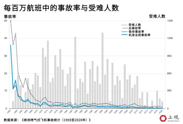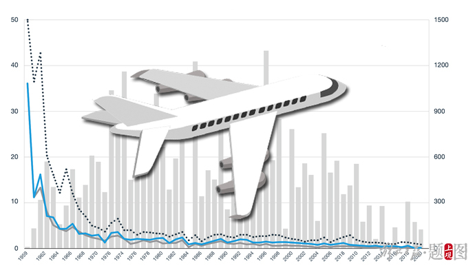 根据波音公司的《商用喷气式飞机事故统计(1959至2020年)》报告显示,随着航班数量的不断增长,在过去60年里,发生事故的比率也在不断下降。在每一百万的航班飞行中,发生致命事故与机体全损事故的次数在个位数内。