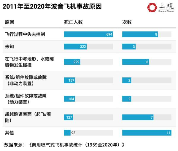 截至发稿前,本次东航mu5735坠毁的原因尚未查明。不过,根据波音公司2021年9月发布的《商用喷气式飞机事故统计(1959至2020年)》报告显示,在2011年至2020年的事故中,飞机在飞行过程中失去控制是导致航空事故的主要原因(并不是由系统组件失效或故障导致的),其占比达到20.5%。并且,这一原因也是导致死亡人数最多的,共导致694人遇难。