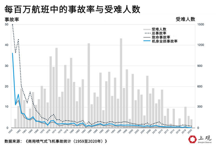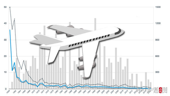 根据波音公司的《商用喷气式飞机事故统计(1959至2020年)》报告显示,随着航班数量的不断增长,在过去60年里,发生事故的比率也在不断下降。在每一百万的航班飞行中,发生致命事故与机体全损事故的次数在个位数内。