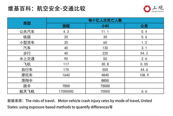 若以里程数作为计算维度,飞机是最安全的交通工具,每十亿公里的死亡人数为0.05人;但若从人次和时间的维度来看,飞机的危险性高于汽车、铁路等交通工具。