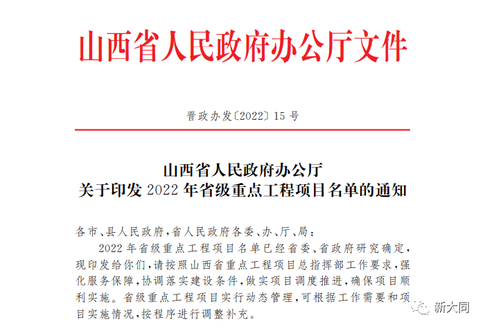 近日(3月14日),山西省政府办公厅印发文件,2022年省级重点工程项目名单确定,涉及产业、科技创新、基础设施、社会民生四大领域共518项重点工程,其中大同有60个项目入选。