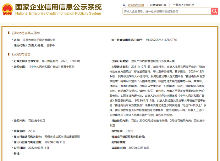 中国网财经3月22日讯(记者 钟文鑫)据国家企业信用信息公示系统,近日,江苏大猴电子商务有限公司因其在网购平台开设的“雅迪电动车官方旗舰店”存在两起虚假宣传行为,被无锡市锡山区市场监督管理局分别罚款2万元、1万元,合计3万元。据公示的行政处罚信息,两起处罚事由分别为:当事人在网页宣传石墨烯电池为铅酸电池,实际发货为锂电池;在直播活动中直播员公布的规则内容与平台公布的活动规则不相符。