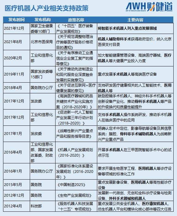 《财健道》不完全统计发现,自2012年以来,上至国务院,中到科技部、工信部等部委,下到北京市医保局等等各部委层面,先后有15项重要政策提及“手术机器人发展应用”。