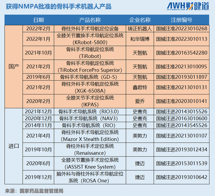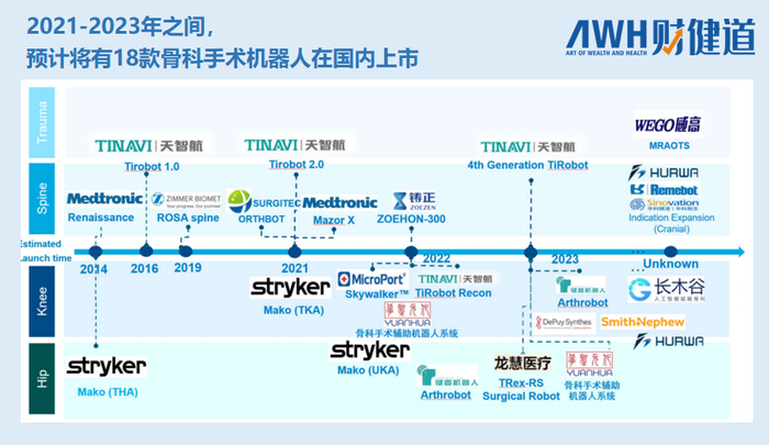 《财健道》粗略统计发现,2021-2023的三年间,国内预计将有18款骨科手术机器人“拿证”上市,这一领域产品创新正处于爆发期。
