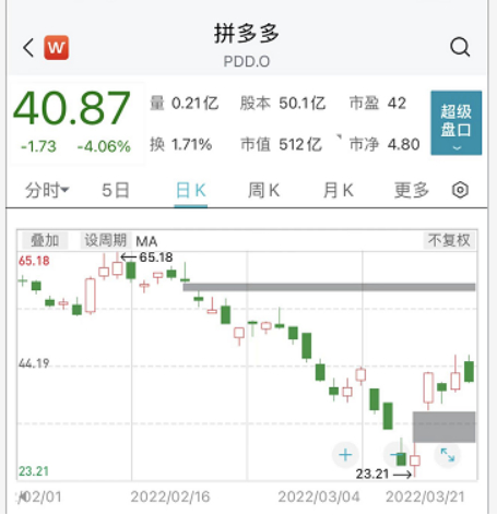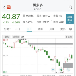 美东时间21日,拼多多(PDD.O)股价高开后一度大涨超过10%,但之后跟随大势走弱,截至发稿下跌4.06%,最新市值512亿美元,年内跌幅约30%。