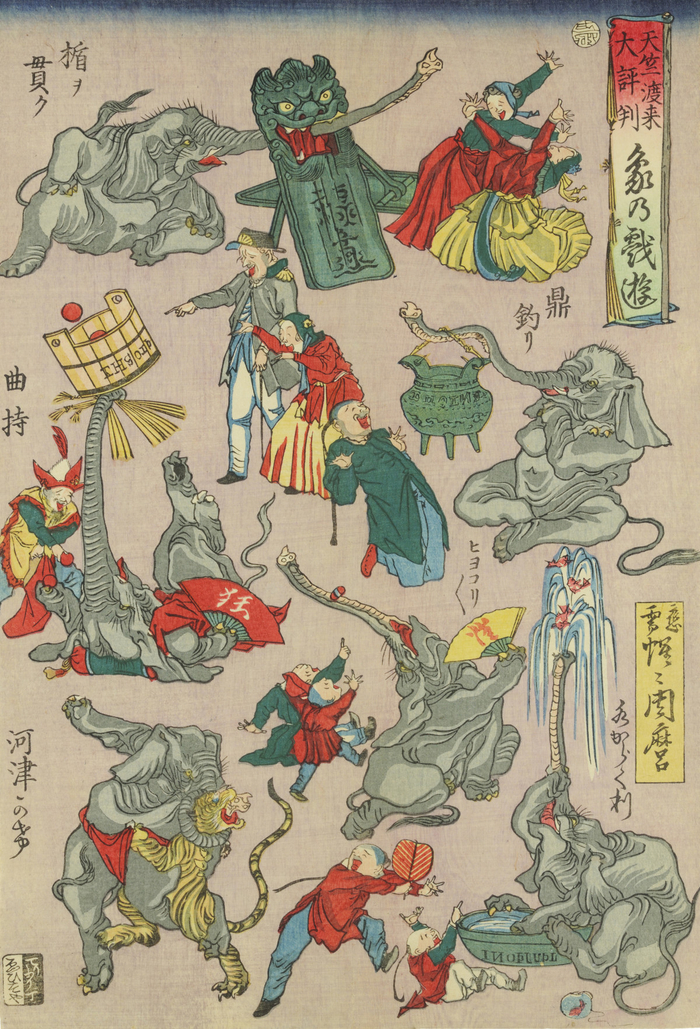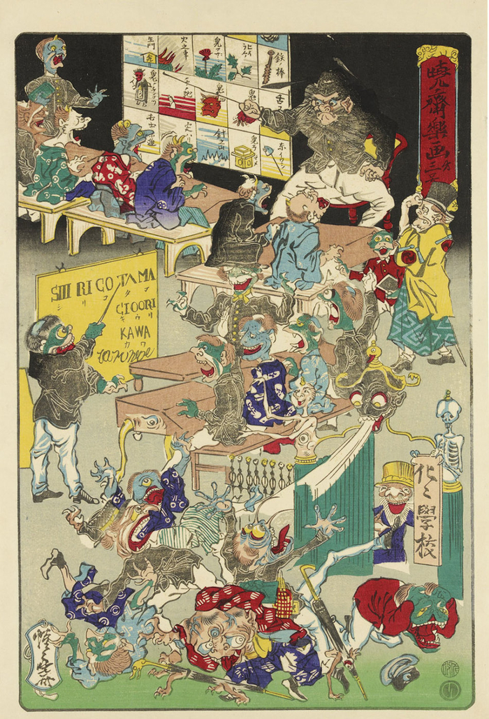 1868年,反对势力升级为一场内战,战争的结束也宣告了幕府政治的终结。江户成为“东京”,新复辟的天皇被命名为“明治”。如今通过读历史知晓,“明治维新”创建了亚洲第一个现代民族国家。但在当时,人们对此褒贬不一,河锅晓斋便是时评家之一。这是一个不确定的时期,渴望西方的认同和对文化输入的试探与警惕相伴而生,由此诞生了一系列滑稽的图像。