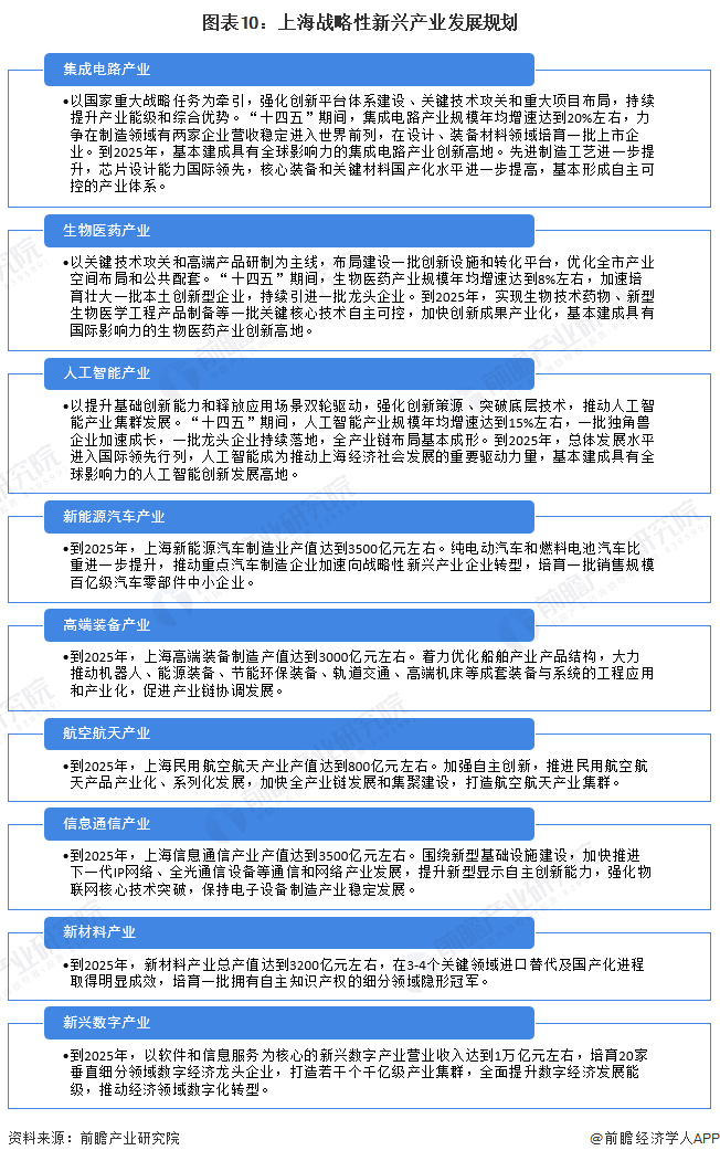 2021年6月,上海市发布了《上海市战略性新兴产业和先导产业发展“十四五”规划》,对各战略性新兴产业的发展方向进行了规划。根据规划,到2025年,上海市战略性新兴产业的产值将超过2万亿。