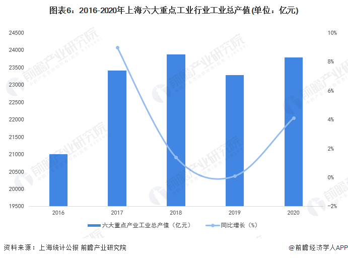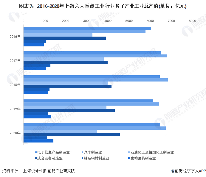 具体来看,电子信息产业和汽车制造业是上海六大重点工业行业中工业总产值贡献最大的细分产业,2016-2020年,电子信息产业和汽车制造业工业总产值合计均超过一万亿元,2020年更是高达13189.3亿元。