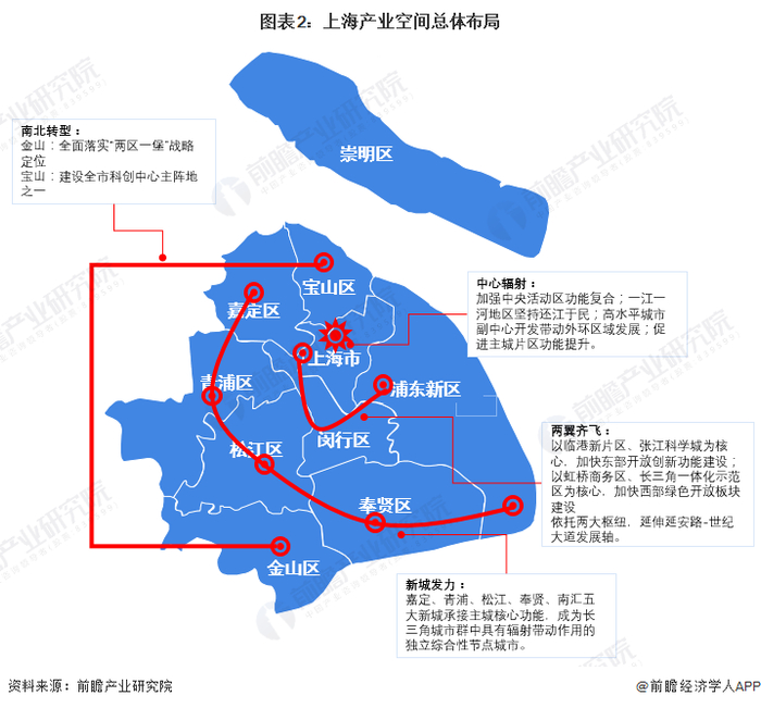 在产业空间布局上,根据《上海市国民经济和社会发展第十四个五年规划和二〇三五年远景目标纲要》,上海将致力于围绕增强城市核心功能,强化空间载体保障,促进人口、土地等资源要素优化布局,科学配置交通和公共服务设施,加快形成“中心辐射、两翼齐飞、新城发力、南北转型”的空间新格局,促进市域发展格局重塑、整体优化。