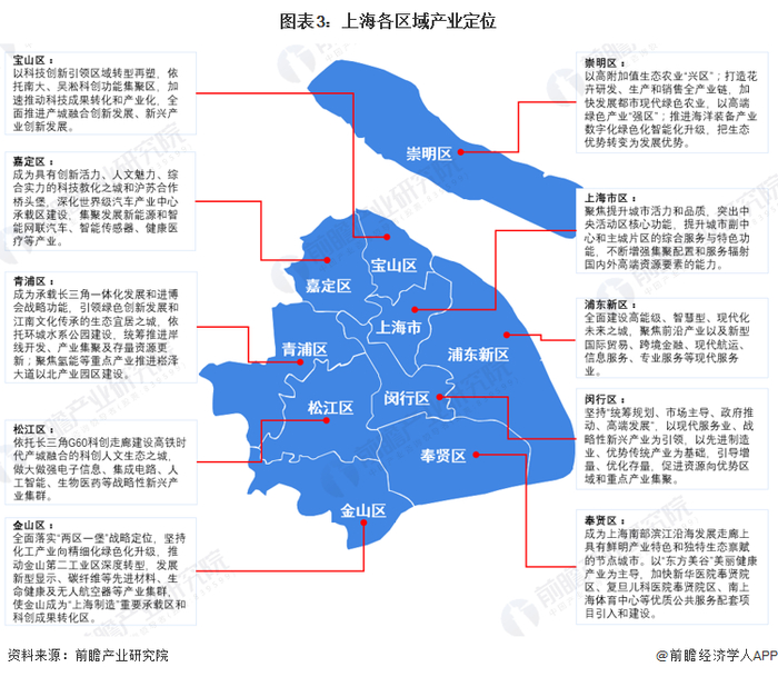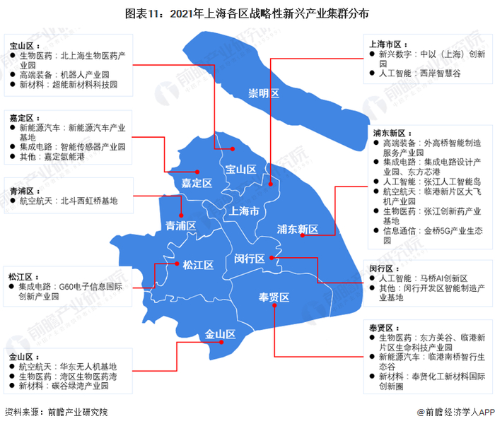 分区域看,各大战略性新兴产业主要分布在上海市区的周边地区,如聚焦人工智能和智能制造的闵行区,专注航空航天、生物医药和新材料的金山区等等,除崇明区外,嘉定、宝山、浦东、奉贤、闵行、金山、松江、青浦均有产业集群入选了“十四五”首批上海特色产业园区,其具体布局如下: