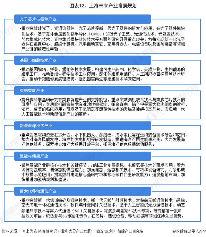 未来产业是指在经济体系中具有重要战略地位,能带动其他产业发展,对国民经济未来发展起引导作用,代表技术发展和产业升级方向的产业。上海的未来产业主要有光子芯片与器件产业、基因与细胞技术产业、类脑智能产业、新型海洋经济产业、氢能与储能产业和第六代移动通信产业。2021年6月,上海市发布了《上海市战略性新兴产业和先导产业发展“十四五”规划》,对各未来产业的发展方向进行了规划,其具体如下: