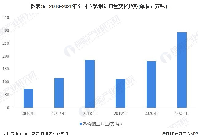 进出口方面,2016年以来,我国不锈钢进口呈现震荡走势。2021年中国进口不锈钢292.7万吨,同比增加112.3万吨,增长62.19%。其中进口不锈钢钢坯135.6万吨,增长49.2万吨,同比增长56.98%。