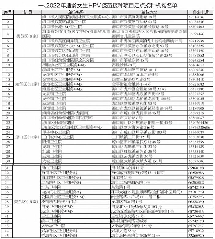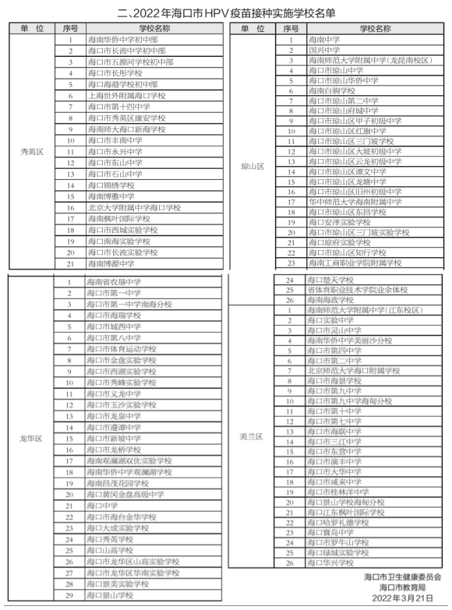 3月21日,海口市卫生健康委员会、海口市教育局发布《关于海口市适龄女生HPV疫苗接种项目实施接种的医疗卫生机构和学校公示》,海口市将于今年4月份开始给予适龄女生HPV疫苗免费接种。