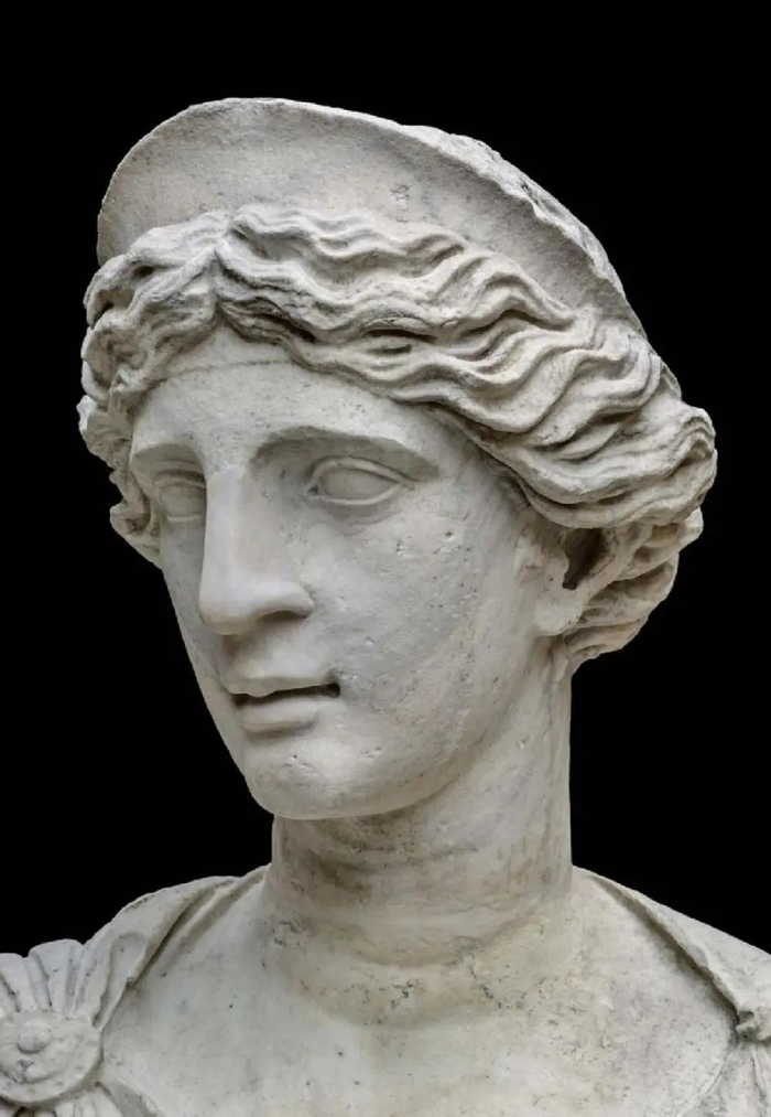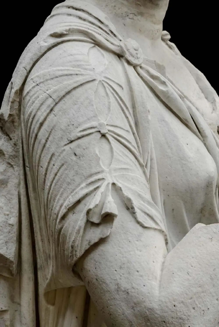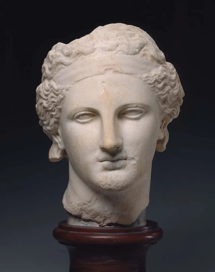 朱诺像(局部),罗马帝国早期,公元前1年末,大理石。身体由卡拉拉大理石制成;头部为彭特利克大理石