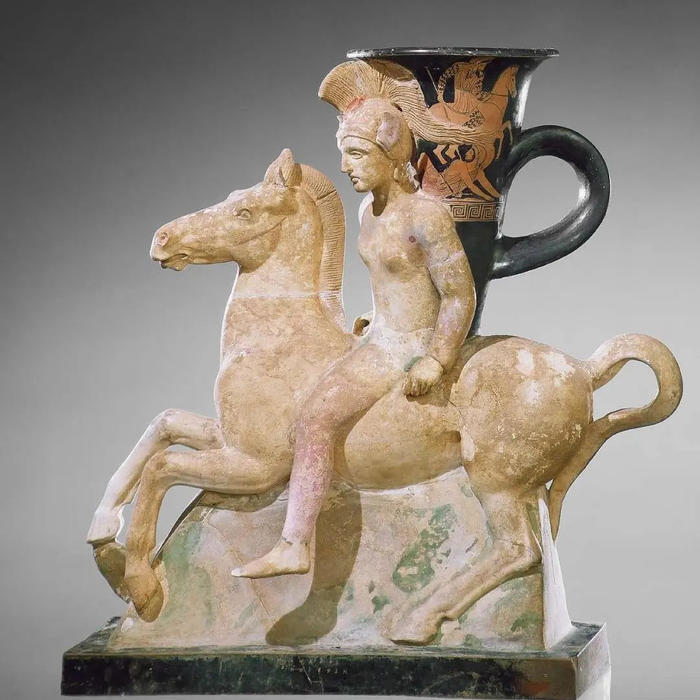 骑着马的亚马逊人形状的来通(酒器),希腊古典时代,约公元前440年,希腊,阿提卡,陶瓷,红色图案