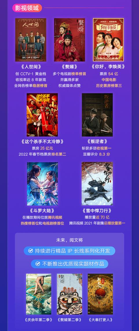 继2021年上半年推出的《赘婿》《斗罗大陆》《叛逆者》《你好,李焕英》之后,在2021下半年以及今年年初,阅文继续贡献了口碑与热度双赢的优质作品。其中,由腾讯影业发起并出品主控、阅文和新丽传媒共同出品的电视剧《人世间》创下了央视一套黄金档收视率近8年新高,全网各榜单稳居榜首,并在口碑上获得了广泛好评。