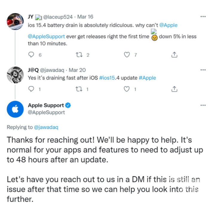 有不少用户也是因为受不了苹果续航下降的情况,向苹果官方账号进行反馈,苹果官方账号 @Apple Support在推特上对于这个情况给出了回复。