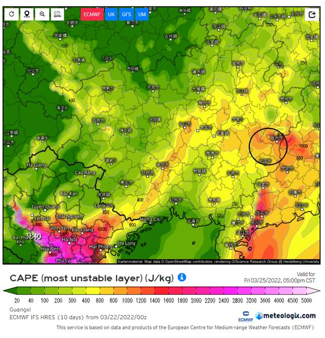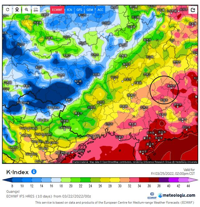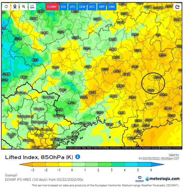 而未来几天,天气的影响却逐渐展现,坠机点附近的天气情况不容乐观,对救援和调查有不利影响。三月以来,我国受到高压暖脊控制,南方大部温度异常偏暖,从而积累了大量热量,而16日到21日,江淮到长江中下游经历了两次强对流过程,其中第二次产生的江淮气旋刚刚入海,江淮气旋进入东海以后拖拽北方冷空气南下,和华南地区的暖湿气流激烈碰撞,冷暖空气激烈相撞必然产生强对流天气,而广西大部处在低空急流中,水汽输送旺盛,梧州刚好处于925hpa边界层急流减速区,更容易产生降水。