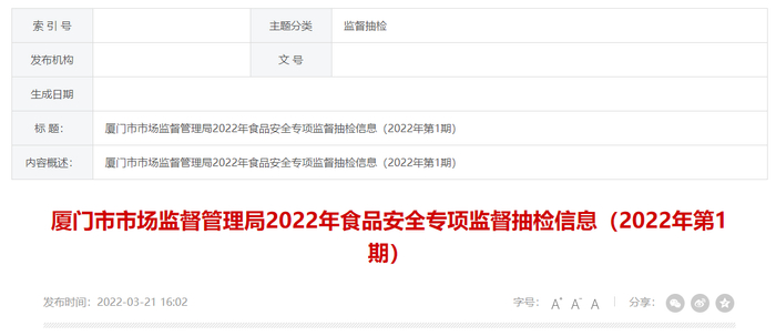 中国质量新闻网讯 3月21日,厦门市市场监督管理局网站发布2022年食品安全专项监督抽检信息(2022年第1期)。本期抽检62批次食用农产品,4批次不合格、58批次合格。合格产品信息见下表。