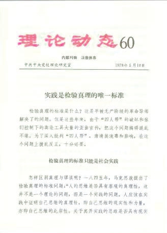 1978年5月10日,中央党校内部刊物《理论动态》第60期发表《实践是检验真理的唯一标准》