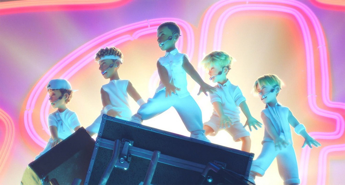 《青春变形记》通过“男孩组合”这种代际差异显著的现象,细腻地表现两个世界的裂痕。后来阿茗大闹“四城男孩”体育馆演唱会,又把深深的分歧弥合。阿茗巨怪先是把吊在空中唱歌的五个成员吓到失色,印证母亲们的看法:偶像都是中看不中用的银样镴枪头。随后众人在高老道的带领下做法,想把阿茗的红色小熊猫之魂剥离时,四城的五子已经镇定下来开始唱歌,在360度旋转镜头和霓虹灯光的映衬下光芒四射。这里到底是他们的舞台。