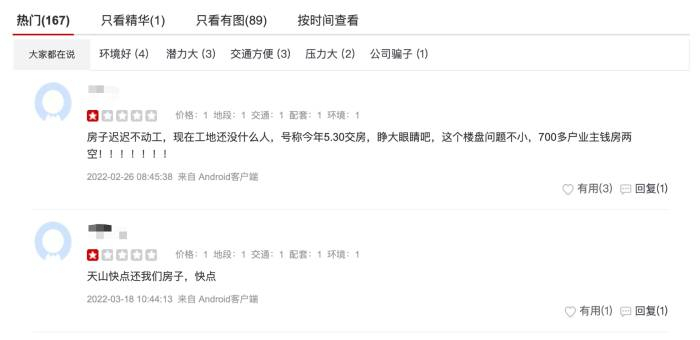 而在人民网政府留言板上,有关天山集团项目的投诉也不在少数。其中,最新一条有关留言为3月16日“邢台天山熙湖二期交房到期,不施工”,内容写道,业主2020年签订购房合同,合同交房日期2020年底,到现在2022年,仍未交房,且项目地目前无人施工,目前既要付租房房租,又要还贷款利息,生活压力大。而对于这一问题,尚未明确解决方案。