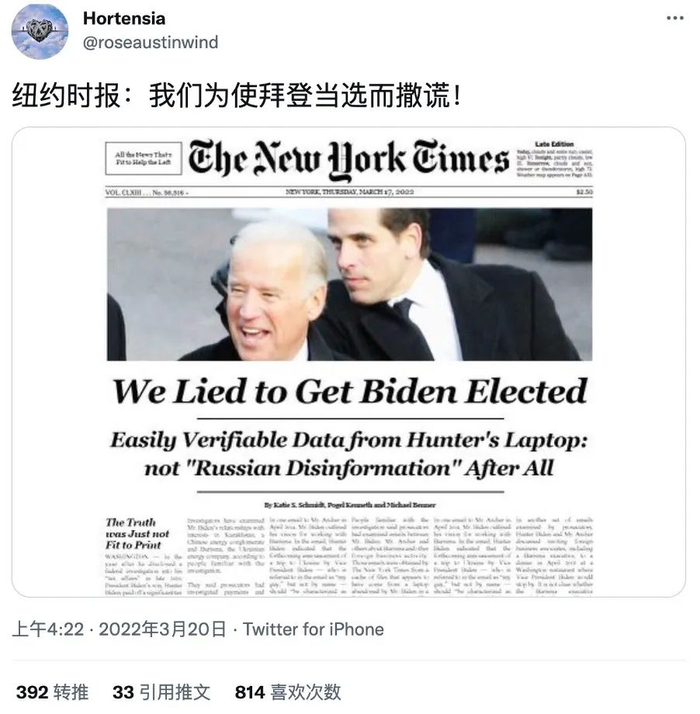 近日,推特上流传一张2022年3月17日的《纽约时报》头版截图,头条标题为“我们为使拜登当选而撒谎”。副标题写着:“亨特的笔记本电脑中存在容易验证的数据:毕竟不是‘俄罗斯假新闻’”。配图为乔·拜登与儿子亨特的合影。