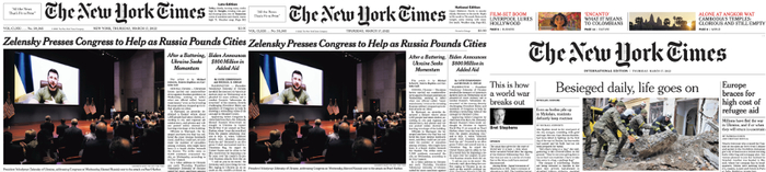分别查看《纽约时报》3月17日纽约版、国内版,以及国际版的头版,均与网传截图有巨大出入:纽约版和国内版的头条均为泽连斯基在美国国会的视频演说,国际版的头条为乌克兰城市的封锁和救援。