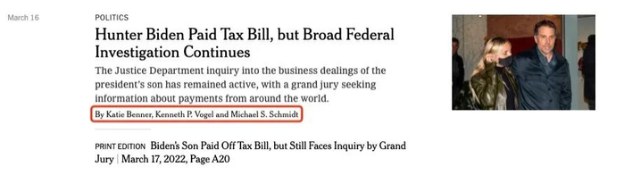 截图显示,这篇报道的作者是Katie S. Schmidt、Pogel Kenneth,以及Michael Benner。然而,经查证,这三人并未给《纽约时报》供过稿。巧合的是,《纽约时报》3月17日的A20版面刊登过一篇由Katie Benner、Kenneth P. Vogel和Michael S. Schmidt写作的稿件。尽管并不完全一致,但是截图中的三位作者的姓名似乎是3月16日报道三位作者姓名的重新排列组合。此外,这篇题为“亨特·拜登支付了税单,但是广泛的联邦调查仍在继续”的报道确实提及了亨特·拜登的笔记本电脑信息泄露问题。
