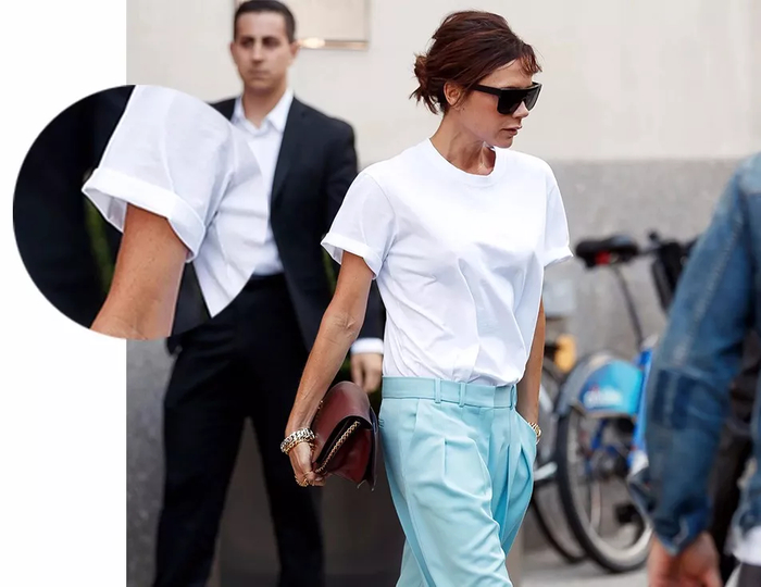 还有一个小心机:可以学学贝嫂稍微把袖子的边边卷一下,在简约中增添一点细节,更精致。