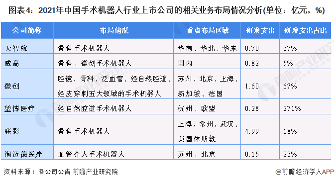 目前,我国手术机器人行业主要上市企业均在境内布局,主要集中在苏州、北京、上海、江苏等地;从研发支出角度来看,行业中主要上市企业的研发支出占比参差不齐;如堃博医疗的研发支出高达271%;而威高股份的研发支出比重仅为5%。