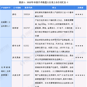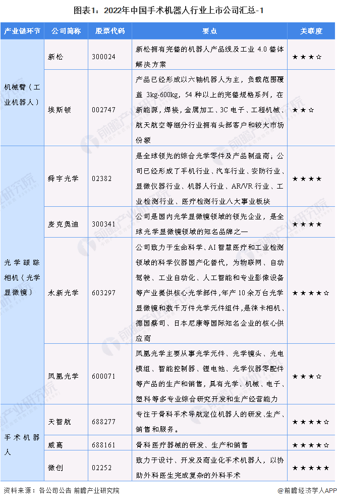 本文汇总了手术机器人行业产业链各环节上市企业,具体包括上游机械臂行业:新松(300024)、埃斯顿(002747);上游光学跟踪相机行业:舜宇光学(02382.HK)、麦克奥迪(300341)、永新光学(603297)、凤凰光学(600071);中游手术机器人行业:天智航(688277)、威高(688161)、微创(02252.HK)、堃博医疗(02216.HK)。