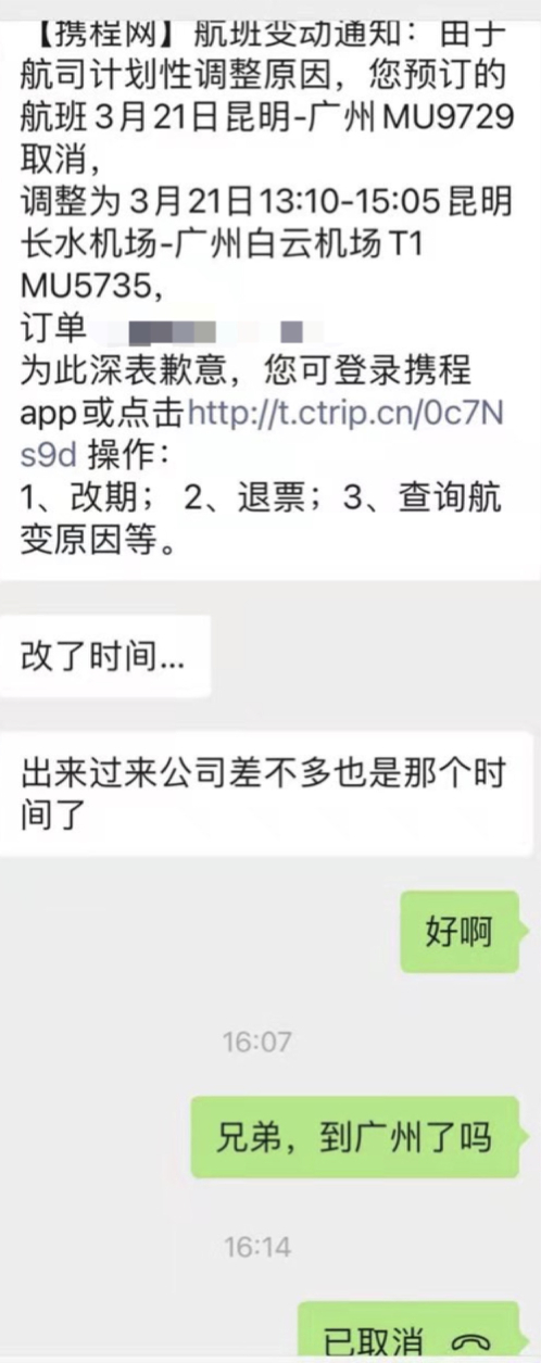 3月21日下午1点,生活在深圳的小西,因为疫情在家隔离,午觉睡到下午4点才醒。“看手机通知,你还没给我发微信,刚想发微信教训你不知道给我报平安,就看到这条新闻。我给你打电话关机,我又核对了一次航班号,再打你电话还是关机。”