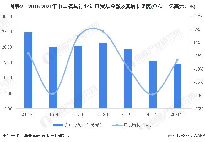 进口方面,随着我国模具行业的继续发展,近年来,模具进口额呈现震荡下行走势。据海关总署统计数据显示,2015年,我国模具进口额为24.85亿美元,到2021年,我国模具进口额下降至14.58亿美元,同比下降6.54%,进口额创近年新低。