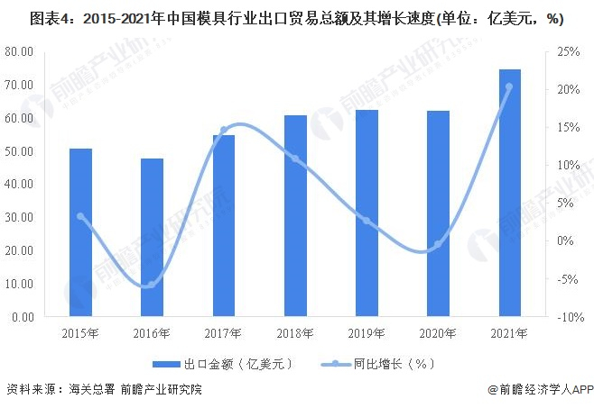 出口方面,近年来,我国模具出口额呈现震荡上行走势。据海关总署统计数据显示,2015年,我国模具出口额为50.82亿美元,到2021年,我国模具出口额提升至74.79亿美元,同比增长20.34%,较2015年增加近25亿美元。