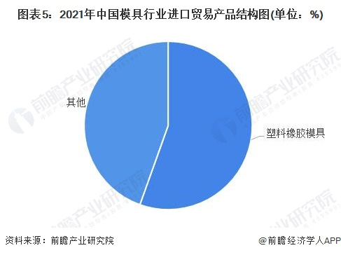 具体到进口产品来看,我国进口模具产品主要为塑料橡胶模具,据海关信息统计数据显示,塑料橡胶模具进口总额占我国模具总进口额的比重在40%以上。数据显示,2021年,我国塑料橡胶模具进口额占总进口额的40.4%;其他类模具进口额占总进口额的59.6%。