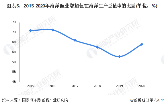 根据中国海洋经济统计公报,2015-2020年,我国海洋渔业增加值在海洋总产值的比重整体呈现波动下降的态势;2020年,我国海洋渔业增加值在海洋总产值的比重较上年有所回升,为5.89%。