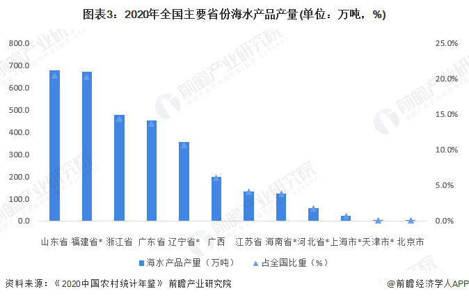 2020年全国海水产品产量共3314.4万吨,其中山东产量第一,福建第二,浙江第三。山东省海水产品产量679.5万吨,占全国海水产品产量的比重高达20.5%。