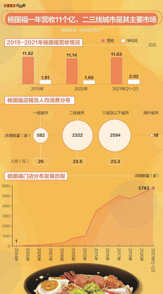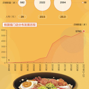 2010年,杨国福把店铺开出东北三省,并在2015年把总部迁到上海,受中国餐饮市场的快速增长影响,杨国福麻辣烫开始以每年1000家的速度快速扩张。截至2021年9月30日,杨国福品牌旗下共有5783家餐厅,二三线城市是其主要根据地。