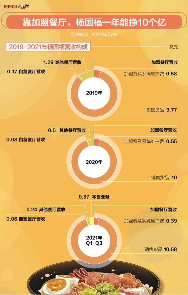 招股书显示,杨国福5783家门店里,只有3家是自营餐厅,其他都为加盟餐厅,而且超过90%的收入来自于加盟餐厅。其中,销售自产货品占29.6%,转售向第三方采购的货品(包括食材、调味料及其他产品,以及设备)占到61.3%。