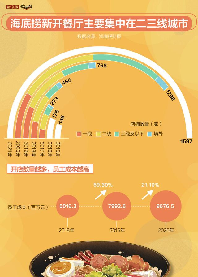 截至2021年6月末的12个月内,海底捞净新增门店623家,在2020年6月末868家门店的基础上增加了71.77%。其中三线及以下城市净新增门店344家,占据新增门店总数一半以上。