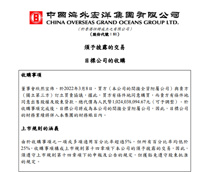 昨日,中国海外宏洋集团有限公司发布公告称,于2022年3月8日,买方中海宏洋地产集团有限公司与卖方汕头市龙光博皓投资咨询有限公司(独立第三方)订立买卖协议,据此,买方有条件地同意购买,而卖方有条件地同意出售股权及股东贷款,总代价为人民币10.24亿元(可予调整)。