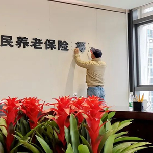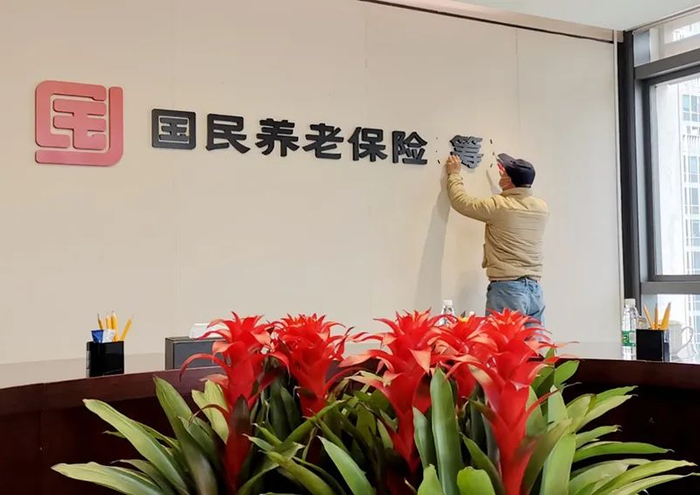 接到批复后,国民养老保险工作人员正在拆下公司名字旁边的“筹”字